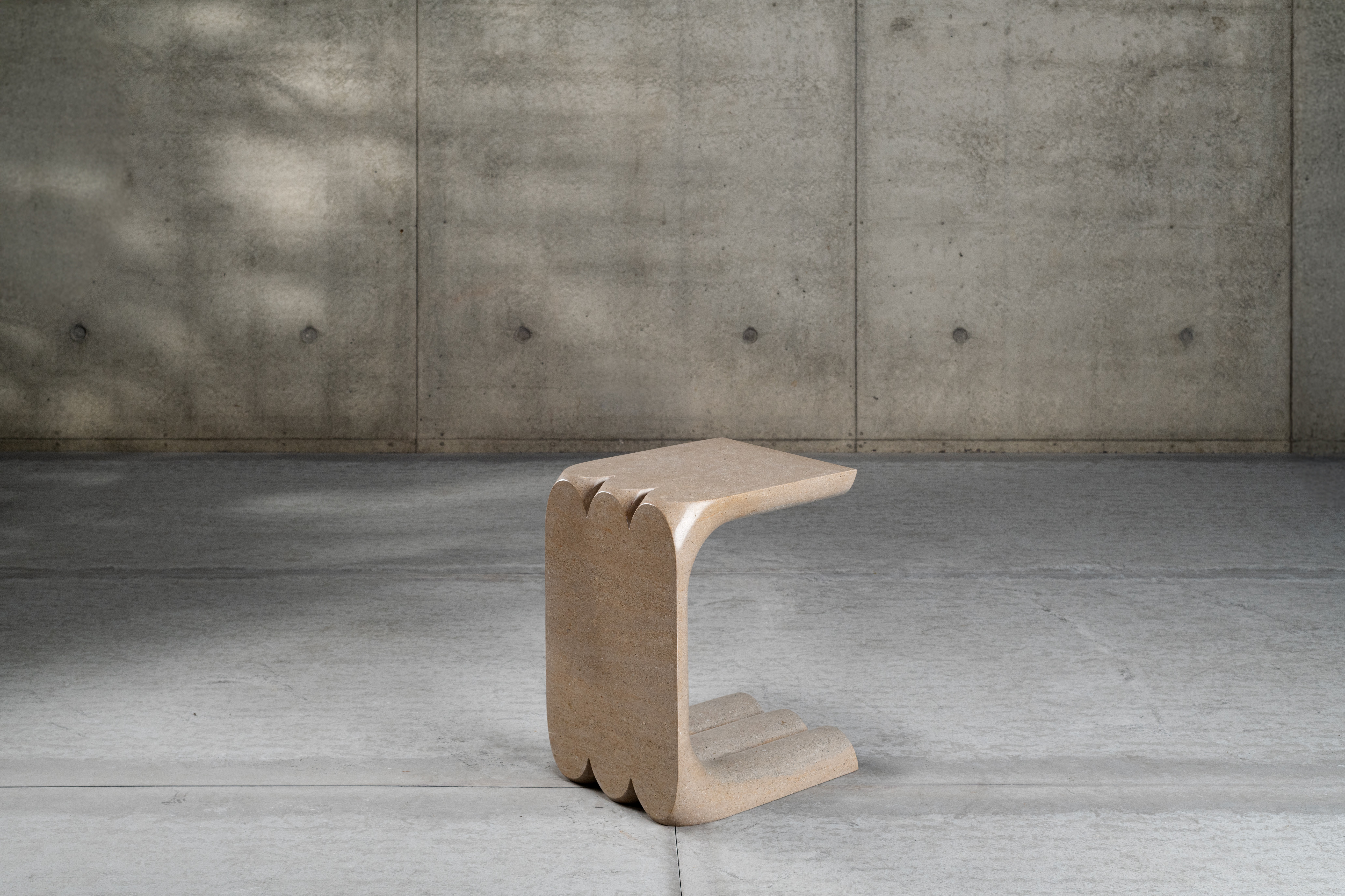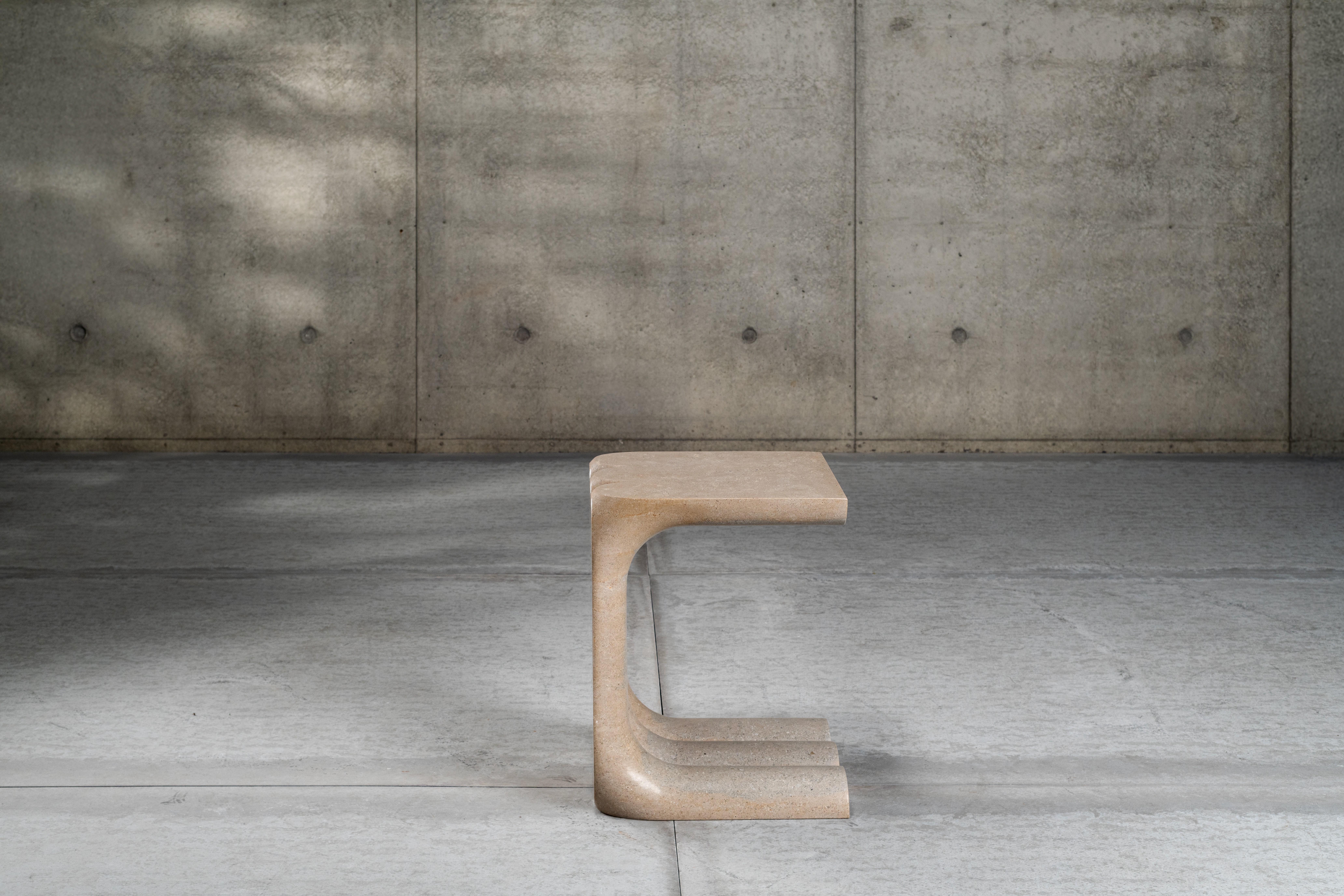 Carved from single blocks of stone, the Monolithic Collection celebrates the dialogue between geometry and material. Each piece, whether bench, console, or side table emerges from the same architectural gesture: a continuous curve that bends and folds upon itself, defining both structure and void.